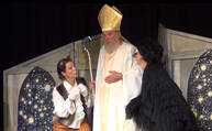 Fritz Weinert, der Theaterleiter, als aufgetakelte Hexe … . Es ist eine Paraderolle für ihn, in der er voll aufblüht. Sie ist ihm auf den Leib geschrieben. Den würdevollen Sankt Silvester präsentiert er glaubhaft… .